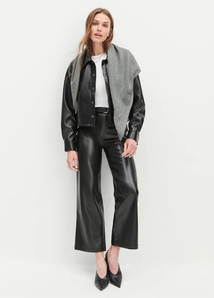 The Brady Crop Shirt in vegan leather is designed for a loose, oversized fit that hits just below the waist for the perfect untucked look. Pointed collar, hidden front buttons and dropped shoulders are standout features.