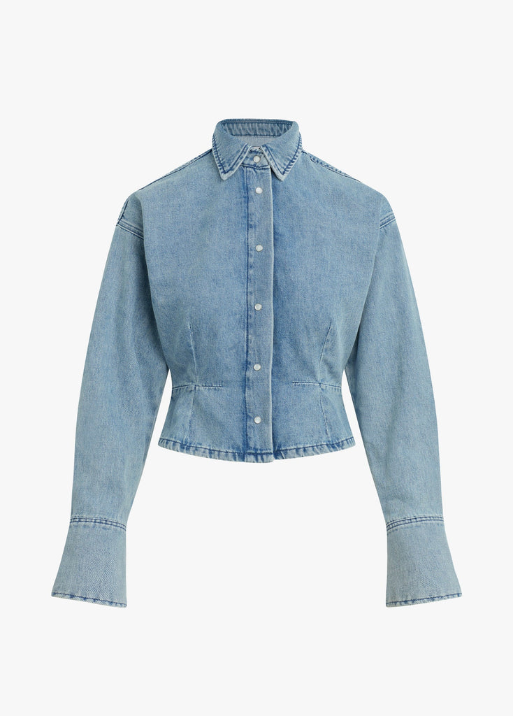 The Eyes On Me Shirt is made to be seen. Lightweight rigid denim in marbled blue with drop shoulders, a cinched waist, pearl snaps and a soft peplum. Slight blouson above the waist and dramatic bell cuffs make this button-up anything but ordinary. 100% cotton