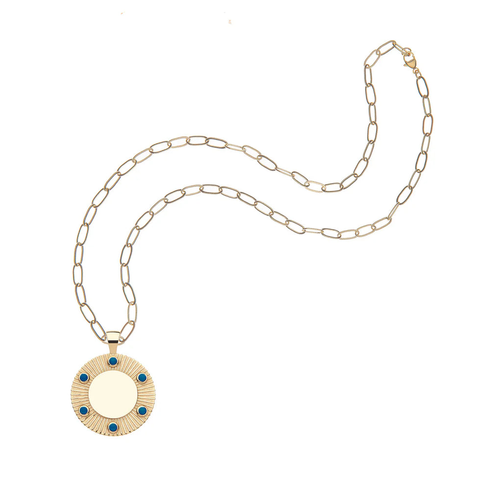 Life is a cycle of constant motion, ever turning like the Earth around the sun. Inspired by the planets circling the sun, the lapis stones on this pendant revolve around an engravable center. Engrave it with your initials or those of someone you love, and let the stones be reminders of those who surround you on your journey.