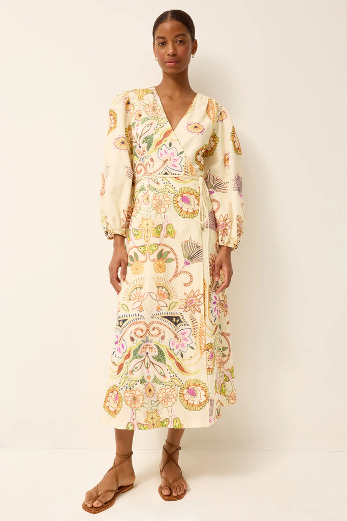 Famously flattering on every figure, the wrap dress hugs in all the right places without revealing too much. A natural choice for dressing up after a day in the sun, this timeless silhouette moves seamlessly from beachside lounging to dinner plans. Everette refreshes the classic with dramatic puffed sleeves and a placement print on a creamy ground.
